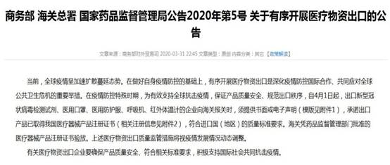 商务部、海关总署、国家药品监督管理局联合发布的“5号公告”,出口医疗物资管理范围为出口新型冠状病毒检测试剂、医用口罩、医用防护服、呼吸机、红外体温计。