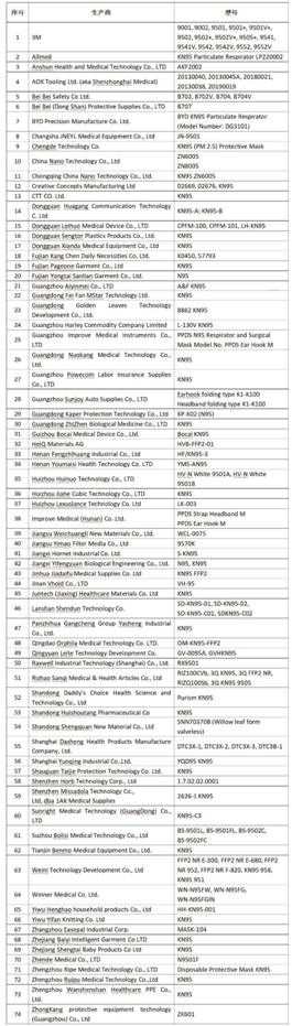 (4) 4月14日,美国FDA发布“已获授权进口”口罩中国生产企业名单,74家位于中国的口罩生产企业获紧急使用授权(EUA),大多数为中国本土生产商(如:比亚迪精密制造有限公司、奥美医疗用品股份有限公司、中国纳米科技有限公司、广州爱音有限公司、金纳尔医疗器械有限公司等),也包括外商独资企业(如:3M中国)。具体名单如下: